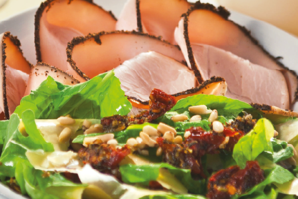 Rúgula, lechuga, pechuga de pavo*, queso parmesano, alcaparras, tomates secos y almendras.