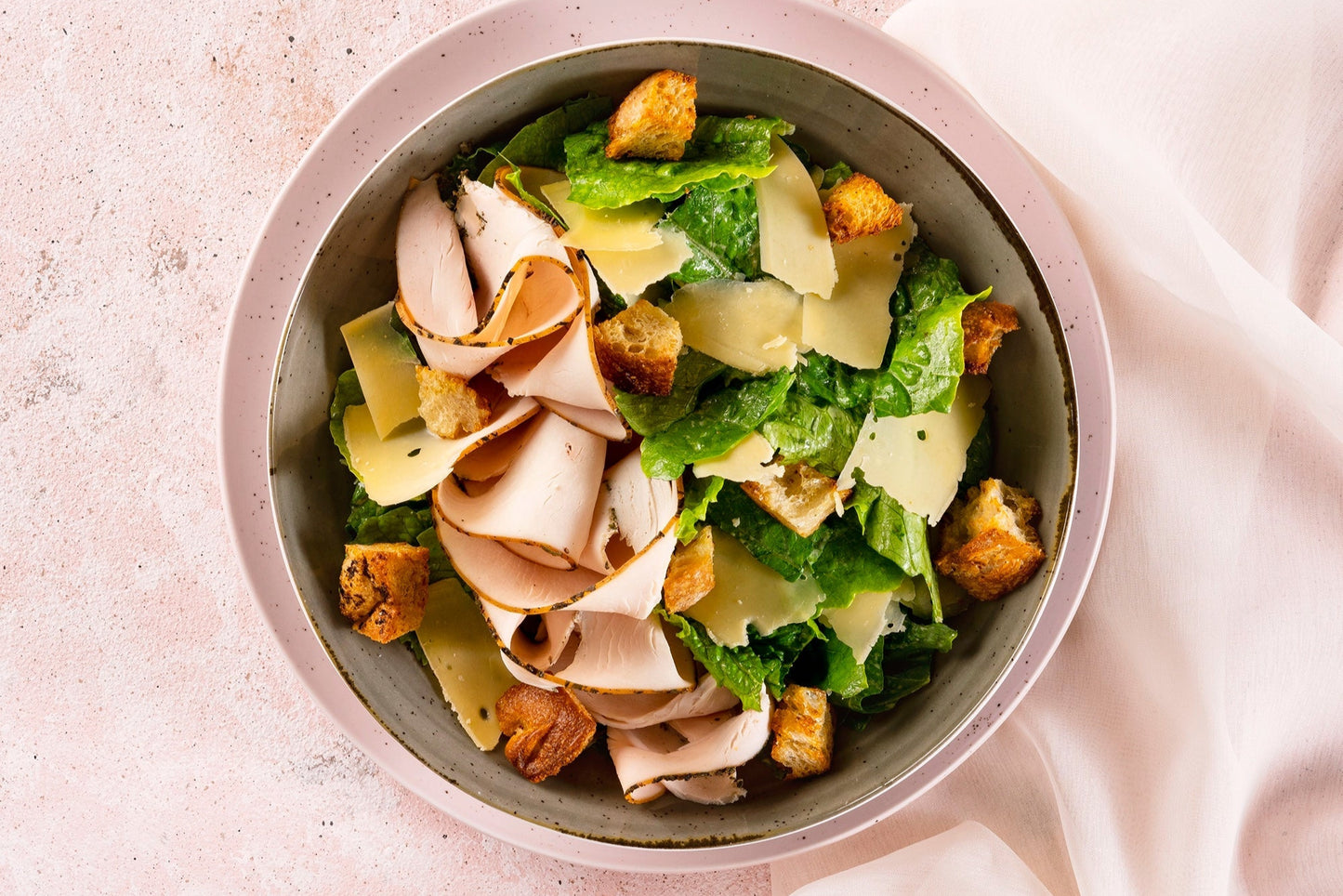 Lechuga romana, pechuga de pavo*, croutones, queso parmesano y salsa de anchoas.
