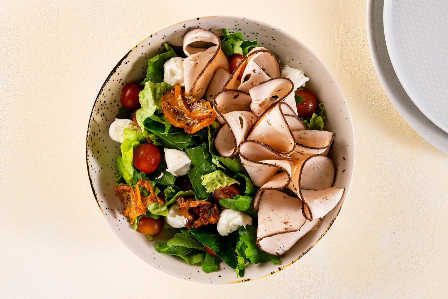 Rúgula, lechuga crespa, espinaca baby, pechuga de pavo*, mozzarella de búfala, tomates cherry y tomates confitados.