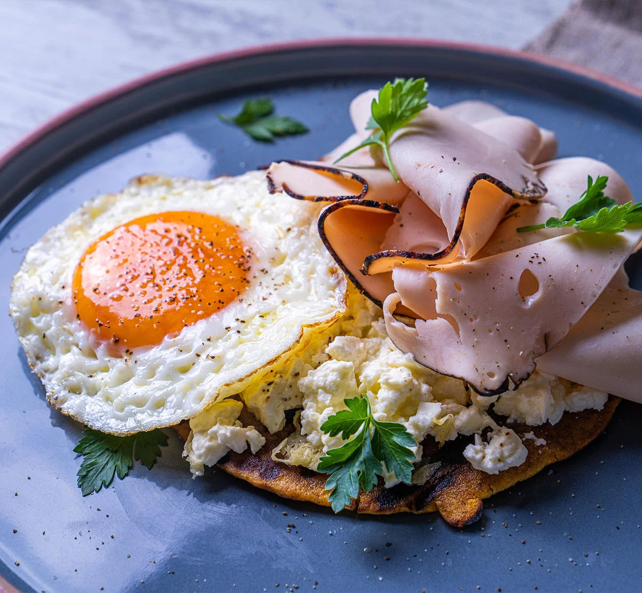 - Sobre la cama de quesito poner la pechuga de pavo selva negra y el huevo frito