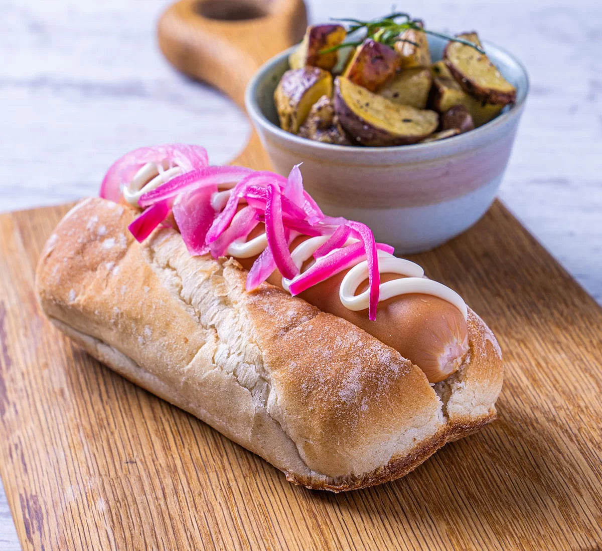 En un sarten agregar agua, vinagre y azúcar. mezclar bien y dejar hervir. agregar las cebollas y dejarlas por 8 minutos Reservar - Abrir el pan en el medio, ponerle la salchicha, agregar la mayonesa y las cebollas encurtidas