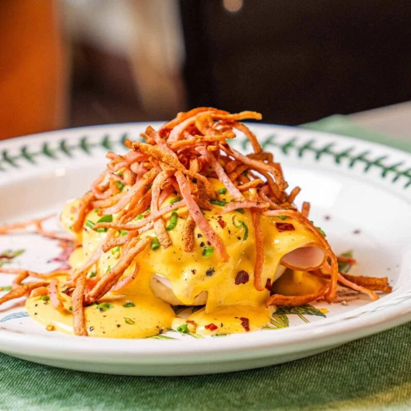 Emplatamos: - En el centro del plato ponemos mitad de un muffin, le ponemos encima u tajada de Jamón de Pavo Ahumado Delipavo y luego el huevo pochado encima de este. Para finalizar, lo bañamos con nuestra salsa holandesa y decoramos con un poco de cebollín y Tocineta de Pavo Delipavo crocante.