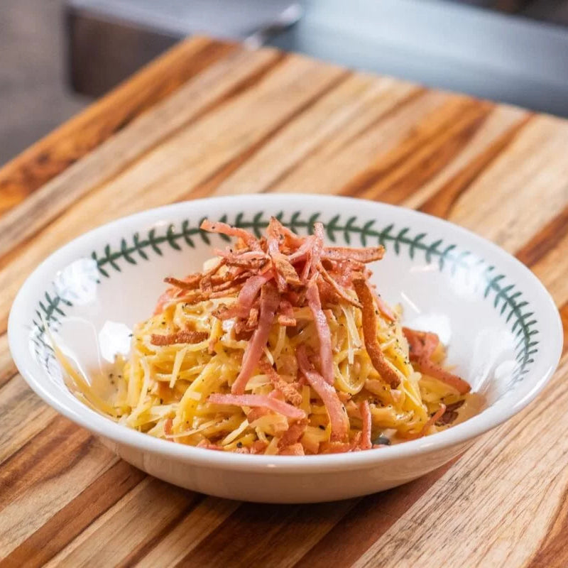 Emplatemos: - En en el plato ponemos la pasta, queso parmesano y por encima Tocineta de Pavo Delipavo muy crocante.