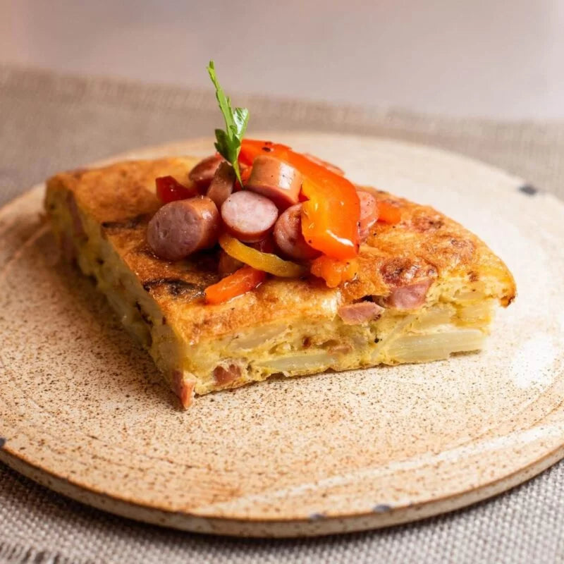 - Cortamos la tortilla en tajadas, por encima le ponemos pimentones encurtidos, Salchichas Campesinas de Pavo Delipavo y perejil.