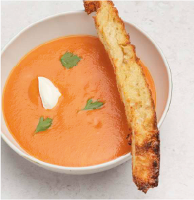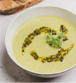 Zucchini, calabaza cebollas y ajo parrillados. Ligeramente aromatizada con comino. Leche de coco y jengibre fresco. Servida con pesto y brotes.